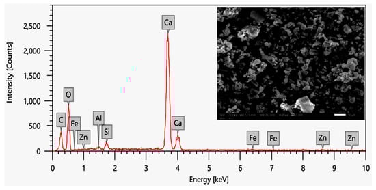 Marble dust is the result of cutting and cleaning natural marble and it is obtained from marble factories. It has many risks to humans when inhaled; therefore, its safety conversion is an environmental necessity. In this work, it was added as a percentage to form the tile composites used for radiation shielding, especially at low energies. The main component of marble dust is calcium carbonate (CaCO3). The SEM imaging and EDX analysis of marble dust was performed before the preparation of the composites, as shown in Figure 2, using a scanning electron microscope of the type SEM-IT 200, JEOL, with an accelerating voltage of 20 keV. The elemental percentages of the marble dust are tabulated in Table 2.