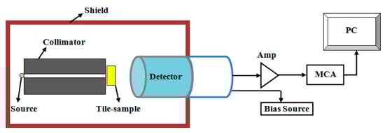 The particle size in the shielding material improves the density, as shown in Table 3, by narrowing the gap between the resulting particles, which leads to an increase in the material’s absorption of incoming photons. The gamma ray attenuation coefficient for the prepared tile composites was determined experimentally using a high pure germanium detector (HPGe) with 24% relative efficiency and different radioactive sources (Cobalt-60, Cesium −137 and Americium −241), the chosen point sources to cover all ranges of energy. The setup of the experimental technique is clarified in Figure 5, where the tile composite was placed between the detector and the source during the measurements. Before the measurements, the energy and efficiency calibration was performed, and after that, the background radiation was measured and subtracted from all measurements. Finally, the tile composite was placed and the count rate () was determined using Genie 2000 software, and by removing the tile composite with the same conditions, the initial count rate (C0) was measured. From these measurements, the linear attenuation coefficient () could be estimated from the following law []: