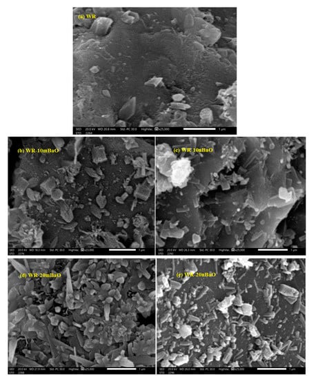 SEM images of the tile composites: (a) WR composite, (b) WR-10mBaO composite, (c) WR-10nBaO composite, (d) WR-20mBaO composite and (e) WR-20nBaO composite.