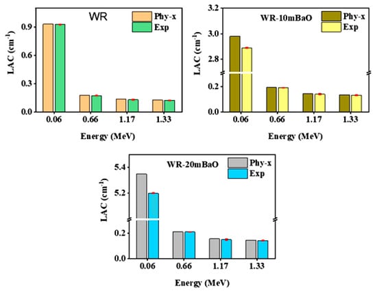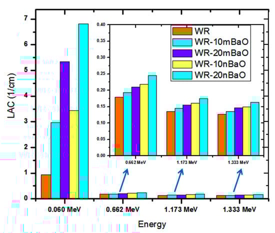 From Figure 9, it can be seen that sample WR-10mBaO (10% micro-BaO) has a lower LAC than sample WR-10nBaO (10% nano-BaO). Similarly, the LAC of sample WR-20mBaO (20% micro-BaO) was lower than that of sample WR-20nBaO (20% micro-BaO). This result verified that a better attenuation proficiency was found for the nano-sized BaO deposition onto the red clay mixed-waste marble. From this figure, it is clear that for all compositions, the nano-sized particles provide greater values of LAC than the micro-sized particles. For instance, at an energy of 0.06 MeV, the LAC values were WR-10mBaO (2.98 cm−1), WR-10nBaO (3.44 cm−1), WR-20mBaO (5.35 cm−1), and WR-20nBaO (6.82 cm−1). The deviations for the deposition of micro- and nano-sized BaO particles were 15% and 27.5% for samples WR-10BaO (10% BaO) and WR-20BaO (20% BaO), respectively.