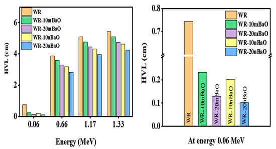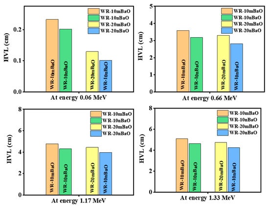 The half-value layer (HVL) is defined as the thickness of an attenuator that attenuates the amount of radiation by a factor of one-half of its initial amount. The HVL of the micro- and nano-sized BaO deposition onto the red clay mixed-waste marble were calculated for the purpose of radiation-shielding efficiency and presented in Figure 9. Micro- and nano-sized BaO deposition onto the red clay mixed-waste marble samples showed the following trend: WR > WR-10mBaO > WR-20mBaO > WR-10nBaO > WR-20nBaO. The results demonstrated that the HVL values of the micro- and nano-sized BaO deposition onto the red clay mixed-waste marble were lower than those of red clay mixed-waste marble alone, which indicates that deposition of BaO onto the red clay mixed-waste marble provides better attenuation. As an example, the values of the half-value layer at an energy of 0.6 MeV were WR (3.87 cm), WR-10mBaO (3.59 cm), WR-20mBaO (3.30 cm), WR-10nBaO (3.18 cm), and WR-20nBaO (2.82 cm).