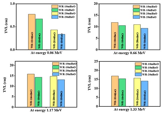In addition, from Figure 9, it was found that sample WR-10mBaO (10% micro-Bi2O3) showed a higher HVL than sample WR-10nBaO (10% nano-Bi2O3). Moreover, the HVL of sample WR-20mBaO (20% micro-BaO) was higher than that of sample WR-20nBaO (20% nano-BaO). This result verified that the nano-sized BaO deposition onto the red clay mixed-waste marble provided better attenuation proficiency than micro-sized BaO deposition. Figure 9 shows that the HVL for both the untreated red clay mixed-waste marble and the nano-sized BaO deposition onto the waste marble increases as the energy of the radiation source increases from 0.06 to 1.33 MeV. For example, the WR-20nBaO sample showed HVL values of 0.10, 2.82, 3.96, and 4.25 cm for incident photon energies of 0.06, 0.662, 1.173, and 1.33 MeV, respectively. The value of HVL is quite the reverse of the value of LAC; hence, the HVL declines with the increase in BaO deposition on the red clay mixed-waste marble. At 0.06 MeV, a 0.74 cm thickness of sample WR can attenuate 50% of the incident photons, whereas a 0.1 cm thickness of sample WR-20nBaO can reduced it. This means that a 7.3 times higher thickness of sample WR is required to attenuate the same amount of incident radiation compared with sample WR-20nBaO.