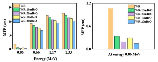It is clear from Figure 12 that the value of MFP is affected by an increase in incident photon energy. For instance, sample WR-20nBaO (20% nano-BaO) showed mean free path values of 0.15 cm, 4.07 cm, 5.71 cm, and 6.13 cm for the incident photon energies of 0.06 MeV, 0.6 MeV, 1.17 MeV, and 1.33 MeV, respectively. This means that 42 times greater MFP was found for the increase in incident photon energy from 0.06 MeV to 1.33 MeV.