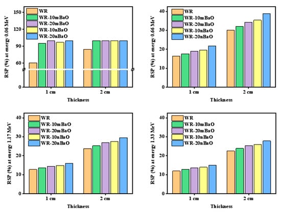 The RSP (%) of samples WR, WR-10mBaO, WR-20mBaO, WR-10nBaO, and WR-20nBaO for the thicknesses of 1 cm and 2 cm is presented in Figure 13. From Figure 13, it was found that the RSP (%) of sample WR-20nBaO was higher than for WR-20mBaO, which is also valid for the 10% BaO sample. Hence, it can be said that the nano-sized BaO deposition onto the red clay mixed-waste marble provided better radiation shielding compared to the micro-sized BaO deposition. It is to be noted that at an energy of 1.33 MeV, the RSP (%) for sample WR (untreated red clay mixed-waste marble) was 12% and 22% for the 1 cm and 2 cm sample thicknesses, respectively. Meanwhile, at the same energy level, the RSP (%) for sample WR-20nBaO (20% of nano-BaO) was 15% and 28% for the 1 cm and 2 cm sample thicknesses, respectively. It was found that a WR-20nBaO sample of 2 cm thickness can shield approximately double the amount of incident photons than the same sample with a thickness of 1 cm.