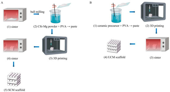 The manufacturing process of a SCM scaffold is illustrated in Figure 1A while the process for producing a high-precision UCM scaffold is depicted in Figure 1B. The typical fabrication process of a SCM scaffold involves the sintering of ceramic precursors. We propose a novel approach for producing high-precision CSi-Mg scaffolds that involves eliminating the step of sintering ceramic precursors. This method is not only applicable to CSi-Mg scaffolds but can also be applied to other inorganic ceramic materials.