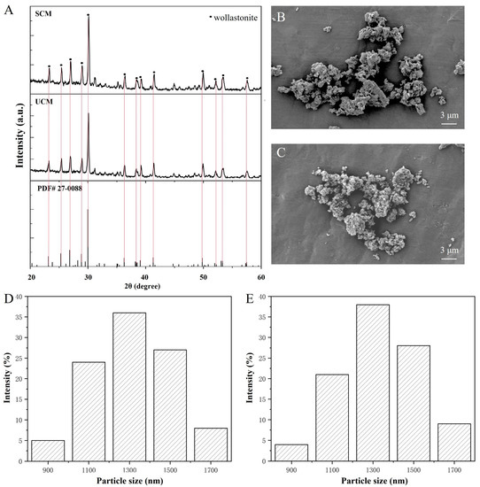 Characterization of the SCM and UCM powders after sintering at 1140 °C. (A) XRD patterns of the SCM and UCM powders. (B) Scanning electron microscopy image of the SCM powders. (C) Scanning electron microscopy image of the UCM powders. (D) The particle size distribution of the SCM powder. (E) The particle size distribution of the UCM powder.
