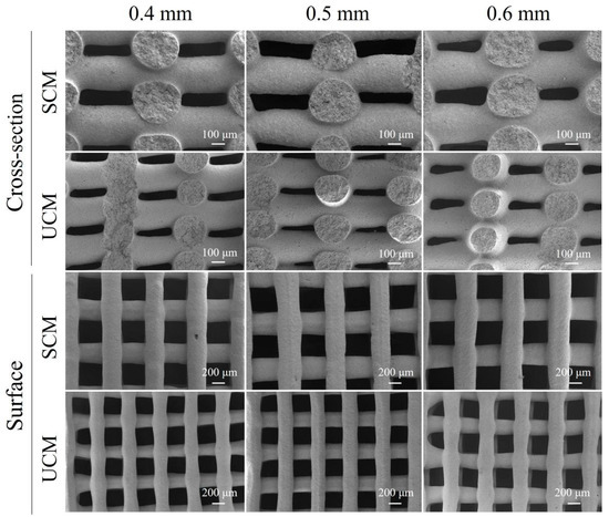 SEM micrographs of the cross-section and surface of the SCM scaffold and UCM scaffold fabricated using different nozzle diameters (0.4 mm, 0.5 mm, 0.6 mm).