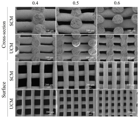 SEM micrographs of the cross-sections and surfaces of the SCM scaffold and UCM scaffold fabricated using different filling densities (0.4, 0.5, and 0.6).