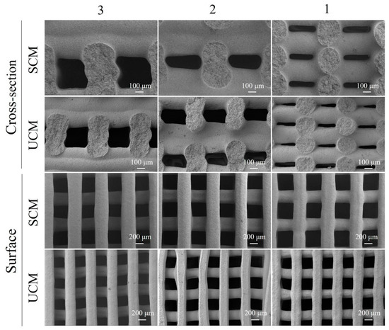 In all of the surface and cross-sectional views, under the same conditions, the UCM scaffold exhibited finer lines, smaller pore sizes, and greater shrinkage compared to the SCM scaffold, further demonstrating the great development potential of the UCM scaffold.