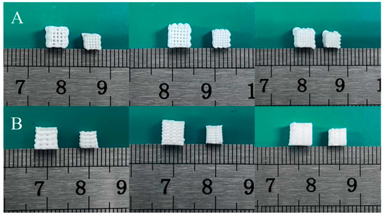 In the process of scaffold manufacturing, process parameters are important factors in determining the final scaffold performance, especially the mechanical strength of the sample. Therefore, we conducted a series of studies to explore the effects of process parameters, such as slurry-filling density and printing layers, on scaffold sample performance. For example, we studied the effect of different filling densities on scaffold performance, as shown in Figure 6A, where samples with filling densities of 0.4, 0.5, and 0.6 are arranged from left to right. We can see that as the filling density increases, the pore size of the scaffold gradually decreases. In addition, we also studied the effect of different layers on scaffold performance, as shown in Figure 6B, where samples with three, two, and one layers are arranged from left to right. We can see that as the number of layers increases, the pores on the sides of the scaffolds become more and more pronounced. In Figure 6, all UCM scaffolds under the same conditions have greater shrinkage compared to the SCM scaffolds. During scaffold manufacturing, UCM scaffold samples undergo significant shrinkage, which occurs during scaffold sintering and includes shrinkage in length, width, and height. In addition, modifying the powder material enables us to produce scaffolds using various materials, including hydroxyapatite and tricalcium phosphate.