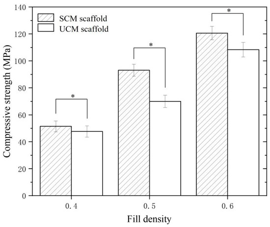 The compressive strengths of scaffolds with different filling densities (* p < 0.05).