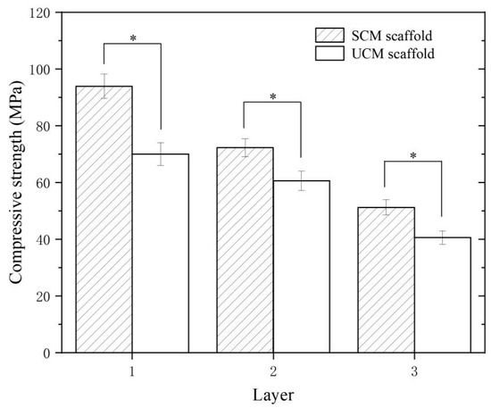 The compressive strengths of scaffolds with different numbers of layers (* p < 0.05).