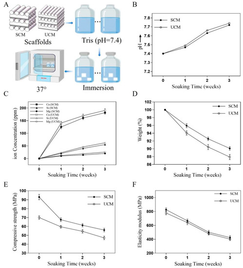 Figure 9E shows the variation of compressive strength in relation to soaking time. During the degradation process of the material, the compressive strength gradually decreased. In this process, the compressive strength of the SCM scaffold reduced by about 39.93%, from approximately 93.09 MPa to approximately 55.92 MPa, while that of the UCM scaffold decreased by about 32.70%, from approximately 70.04 MPa to approximately 47.14 MPa. After the entire 3-week soaking period, the UCM scaffold still had a considerable amount of compressive strength, indicating good mechanical properties. This aligns with our previous conclusion, that the mechanical decay rate of the scaffold is greater in the initial stages and that over time, the rate of mechanical decay gradually decreases [22]. On the other hand, this also corresponds with the trend of mass decay shown in Figure 9D.
