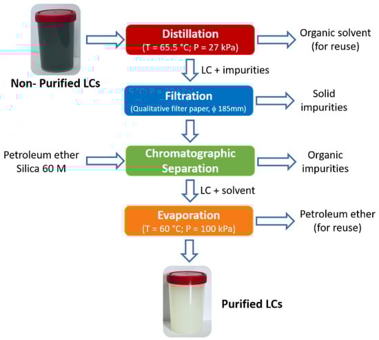 The purification process starts with a vacuum distillation (applying a reduced pressure of 27 kPa at T = 65 °C) to remove the organic solvent used during the industrial extraction process. The distilled solvent was collected to be reused in the extraction line at ENVIE2E. As a result of the distillation step, solid particles were found, together with the LC containing blends. Consequently, a filtration of these impurities was performed using a funnel and a qualitative filter paper (Whatman®, Global Life Sciences Solutions, MA, USA; Grade 287 1/2, diameter 185 mm). Afterwards, a separation by column chromatography was conducted in order to enhance the purity of the LC samples. Using this technique, silica (SiO2 60 M, 0.04–0.063 mm, Macherey-Nagel, Düren, Germany) was employed as the stationary phase to retain impurities, and petroleum ether (40–60 °C fraction, VWR, Rosny-sous-Bois, France) was used as the mobile phase to recover the LCs. Finally, evaporation of the used solvent was performed and the purified LC mixtures were collected. These obtained mixtures presented a “milky white” appearance, typical of a nematic phase containing molecules possessing mesogenic moieties.