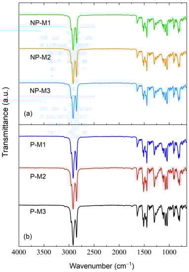 Figure 2 shows the FTIR spectra obtained for three non-purified LC mixtures (NP-M1, NP-M2, and NP-M3) and for three purified LC mixtures (P-M1, P-M2, and P-M3) in the 4000–400 cm−1 region.