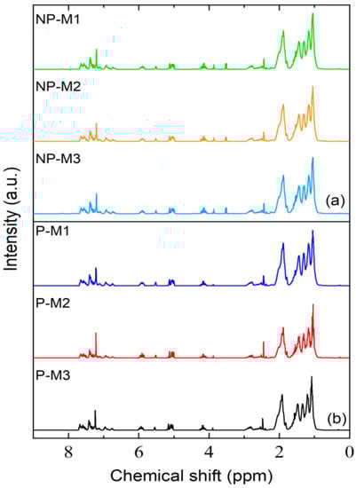 (a) 1H proton NMR spectra of the three non-purified LC mixtures (NP-M1, NP-M2, and NP-M3) and (b) of the three purified LC mixtures (P-M1, P-M2, and P-M3) at room temperature.