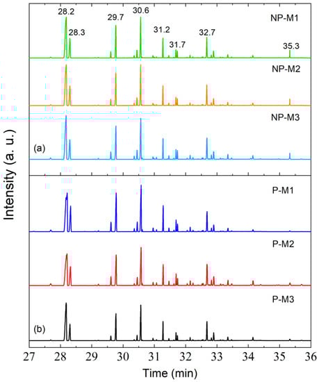 (a) GC chromatograms of the three non-purified LC mixtures (NP-M1, NP-M2, and NP-M3) and (b) of the three purified LC mixtures (P-M1, P-M2, and P-M3). The numbers (28.2, 28.3, …) correspond to the retention times of the most intense peaks reproduced in Table 1.