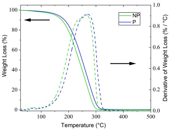 Thermal stabilities of the non-purified and purified LC mixtures were studied using TGA in the temperature range comprised between 25 and 800 °C. Figure 5 presents the obtained two thermograms, exhibiting the mass loss as a function of increasing temperature. It can be deduced that the thermal decomposition followed a one-step degradation for all samples. This behavior indicates that, despite the presence of a large number of molecules in each LC mixture, these compounds degrade thermally in the same range of temperatures.