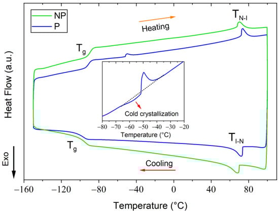 For all samples, the cooling cycle shows only the isotropic-nematic transition (TI-N) and the glass transition (Tg). As expected, a slight shift towards lower temperatures was observed in cooling mode. Therefore, the behavior in heating and cooling modes was different. The values of the observed transitions temperatures and associated enthalpies are given in Table 3 for the heating cycle.