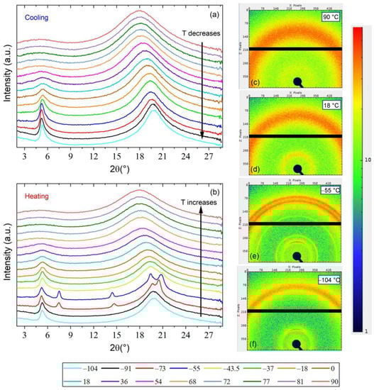 In the nematic phase (73.6 ≥ T > −91.1 °C), diffractograms and 2D X-ray patterns (Figure 7d) were found to be similar to those obtained for the isotropic state. However, the latter present a sharper intensity distribution and a slight 2θ shift. These phenomena were more prominent when the temperature decreased. To illustrate this, at 72 °C, the first peak is centered at 18.3° (d~48.5 nm), with a full-width at half-maximum (FWHM) of 6.5°, and the second one is centered at 5.1° (d~172 nm), with a FWHM of 3.3°. Meanwhile, at −72 °C, the first peak is centered at 19.8° (d~44.8 nm), with a FWHM equal to 4.1°, whereas the second one is centered at 5.4° (d~165 nm), with a FWHM of 0.9°. It should be remembered that the nematic phase has a long-range orientation order, but no positional order. Therefore, the order parameter of the nematic phase increases with decreasing temperature, which explains why these peaks become thinner and sharper when lowering the temperature.