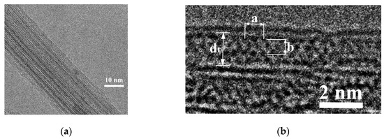 Based on the results of TEM analysis (Figure 3a,b), a chiral SWCNT (16,6) with a calculated diameter of 1.54 nm was selected to model the structure. The NaSn2F5 fragment was obtained from the structure of NaSn2F5 (P42/nbc a = 9.02 Å, c = 13.685 Å [28]). The selected fragment corresponds to the projection onto the (110) plane of the original structure. The axis of the nanotube coincides with the direction [2 3] of the sodium pentafluorodistannate’s tetragonal structure. Combining the calculated SWCNT fragment and NaSn2F5 fragment, we obtained an atomic model of the NaSn2F5@SWCNT nanocomposite (Figure 3c). The crystal model is represented by 90 cations (30 Na atoms and 60 Sn atoms) and 150 anions (F atoms). The SWCNT model is represented by 1208 carbon atoms. The diameter of the modelled SWCNT is dtm~1.54 nm, and the sizes of the hexagons of tin atoms are am~0.88 nm and bm~0.68 nm (Figure 3c). The sizes obtained from the model are in good agreement with the actual sizes measured from the microphotograph.
