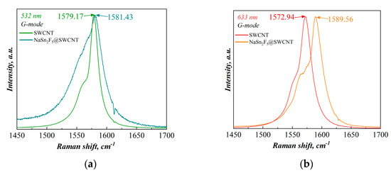 Raman spectroscopy of carbon nanotubes and the NaSn2F5@SWCNT nanocomposite was carried out with a 3D scanning laser Raman spectrometer Confotec NR500 (SOL Instruments, Minsk, Belarus) using a green laser (532 nm, ~2.33 eV) and a red laser (633 nm, ~1.96 eV).