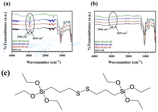 3.2. Infrared Spectroscopy—MSN and Surface Modifications