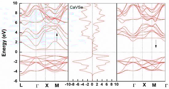 Figure 10 shows that in Ca0.75V0.25Se, Ca-4s states, with a small contribution from S-3s states, dominate the bottom portion of the valence band, while Ca 4s and S-3p levels at the Fermi surface control the upper portion of the valence band. For spin-up states, V-3d states can be observed in the upper section of the valence band. For spin-up states, they are close to the Fermi surface, while for spin-down states, they are a few electron volts below the Fermi surface. In the spin-up situation, Ca 4s states dominate the bottom of the conduction band above the Fermi surface, whereas in the spin-down situation, Ca 4s and V-3d states dominate.