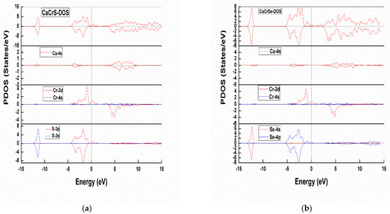 The partial density of states for Ca1-xCrxS and Ca1-xCrxSe at x = 0.25 in B1 phase is depicted in Figure 8 and the overall density of states was decomposed into s-, p-, and d- orbital contributions to perform a qualitative investigation of each set of energy bands of Ca1-xCrxS and Ca1-xCrxSe.