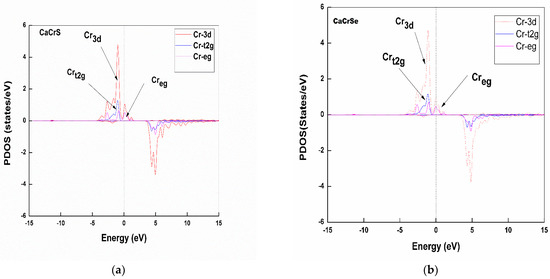 (a) Partial density of states of Ca0.75Cr0.25S and (b) Ca0.75Cr0.25Se.
