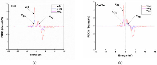 Partial density of states of V-3d states in (a) CaVS and (b) CaVSe.