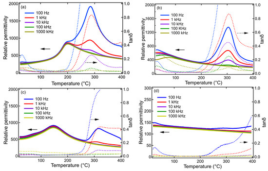 In Figure 3b, BZN seems to show the strongest relaxor behavior among all samples, showing strong frequency dependence in permittivity and loss tan, where the permittivity peaks move to higher temperatures with increasing frequency. In a similar study for porous BZN, the maximum permittivity also occurs around room temperature with strong frequency dispersion and reaches 1.87 [13]. Similar to BTN and SZN, the permittivity and dielectric loss of BZN significantly increase from 200 °C and then decline at 300 °C. The corresponding peak at 300 °C could be associated with the dynamics of polar nano regions in this relaxor composition [13] or space charge effects.