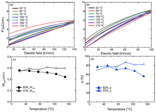 Temperature-dependent electric field-polarization loops of BZN (a) and STN (b) from room temperature to 175 °C under the electric field of 140 kV/cm and 100 kV/cm respectively; calculated recoverable energy density (Wrec) and energy storage efficiency (ƞ) from room temperature to 150 °C for BZN (c) and STN (d).