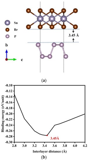 where , and represent the total energy of the heterojunction, phosphorene and SnBr2 monolayer, respectively. n indicates the number of P in the unit cell in the heterojunction, and a smaller binding energy indicates a more stable material structure. To ensure that the P/SnBr2 heterojunction had the lowest binding energy, we gradually increased the layer spacing from 2.8 Å to 4.2 Å and calculated their corresponding binding energies separately to obtain the relationship between the binding energy and the layer spacing, as shown in Figure 1b. It can be seen from Figure 1b that the binding energy of the heterojunction system was the lowest at the layer spacing of 3.45 Å. Therefore, the layer spacing was taken as 3.45 Å when the structure was constructed, and this layer spacing was used in the subsequent electronic characteristic analysis in this paper.