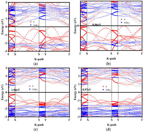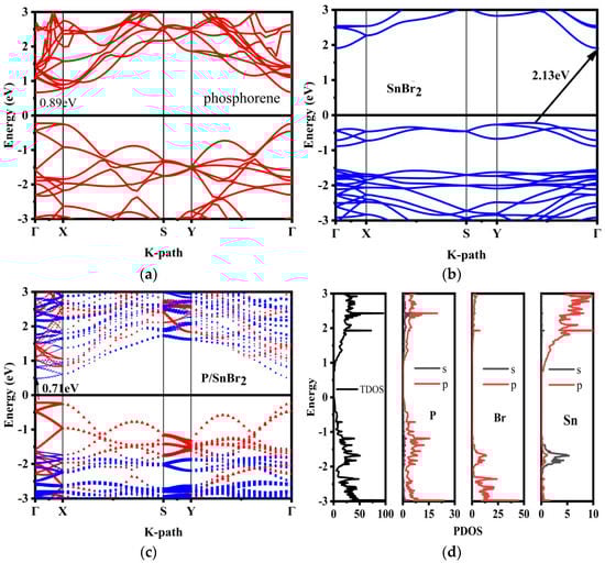 Based on the most stable heterojunction system, we further calculated the energy band structures of the phosphorene (shown in red) and SnBr2 (shown in blue) monolayers and the projected energy band structures of the heterojunctions, as shown in Figure 2a–c, respectively.