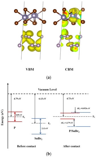 In order to fully understand the electronic structure properties of the P/SnBr2 heterostructure, we performed partial charge density calculations and analysis for the CBM and VBM, as shown in Figure 3a. It can be clearly seen that the VBM came from phosphorene, and the CBM mainly came from SnBr2, with some coming from phosphorene, which is consistent with the conclusion of the energy band structure diagram of the heterojunction.