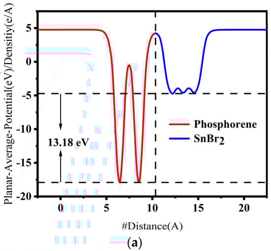 The average planar electrostatic potential of the P/SnBr2 heterojunction, normal to the heterostructure (along the Z-direction), is illustrated in Figure 4a. The outcomes demonstrated that the potential of the phosphorene monolayer was more profound compared to that of the SnBr2 monolayer. The heterojunction bilayer exhibited an electric potential difference of 13.18 eV, which implied the existence of an electrostatic field perpendicular to the interface direction. Moreover, due to the higher electron negativity of phosphorene compared to the SnBr2 monolayer, the former has a more profound electrostatic potential compared to the latter. Therefore, when the P/SnBr2 heterostructure was formed, electrons were spontaneously transferred from the SnBr2 layer to the phosphorene layer, which generated a strong built-in electric field through the heterostructure. The inherent electric field generated in the heterostructure enhanced the segregation efficiency of the photogenerated charge carriers and reduced their recombination, leading to the development of a P/SnBr2 heterostructure that exhibited excellent optoelectronic properties. In order to display the charge transfer of heterostructures more clearly, we calculated the average electron density difference in the heterostructures along the Z-direction. As shown in Figure 4b, the yellow part represented the aggregation of electrons and the cyan part represented the dissipation of electrons; the positive values represented the gain of electrons and the negative values represented the loss of electrons. We can see that after the formation of the heterojunction, the charges of the two layers were redistributed, with the phosphorene layer losing electrons and the SnBr2 monolayer gaining electrons. In order to quantitatively estimate the electron transfer, we performed a Bader charge analysis. The amount of charge transferred from the phosphorene monolayer to SnBr2 monolayer was 0.149 e.