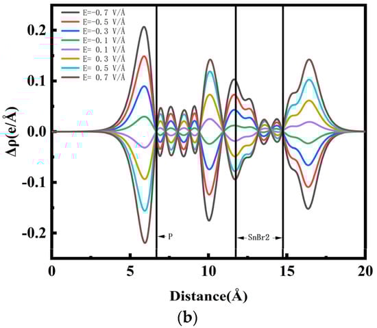 In order to better understand the effect of the electric field on the interfacial properties of the P/SnBr2 heterostructures, we calculated the difference in the average planar charge density of the heterostructures along the vertical z-axis under different positive and negative electric fields. From Figure 5b, it can be clearly seen that the electron transfer increased rapidly when a negative electric field was applied, while the electron transfer from phosphorene to SnBr2 increased gradually under a positive electric field as the electric field increased to 0.7 V/Å. Our findings demonstrated that the intensity and orientation of the electric field significantly influenced the electronic and interfacial properties of the P/SnBr2 heterostructures. This effect could efficiently adjust the energy band structure and interfacial interactions, thereby, enhancing their potential applications in nanoscale optoelectronic devices.