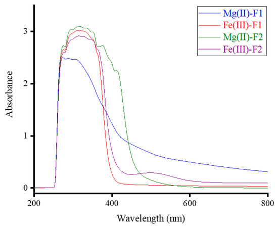 The complexes of F1 and F2 with Mg(II) and Fe(III) ions were dissolved in a dimethylsulfoxide (DMSO) solution, and their UV-visible spectra were recorded in the 200–1000 nm wavelength range, as shown in Figure 2. The spectra of the four complexes displayed a strong, broad absorption band in the 260–500 nm range for Mg(II)-F1, 260–400 nm for Fe(III)-F1, 260–450 nm for Mg(II)-F2, and 260–600 nm for the Fe(III)-F2 complex. These absorption bands, with a maximum wavelength (λmax) at approximately ~320 nm, may be due to intra-ligand transitions (n→π*; π→π*). The UV-visible spectrum of the Fe(III)-F2 complex also exhibited a weak absorption band at 500 nm, which may be due to the metal-to-ligand charge transfer band (MLCT) [23,24]. The widening of the absorption bands decreased in a specific order: Mg(II)-F2 > Mg(II)-F1 > Fe(III)-F2 > Fe(III)-F1.