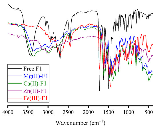 The FT-IR spectra of the free F1 and its metal-based complexes.
