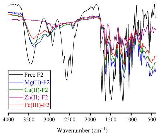 The FT-IR spectra of the free F2 and its metal-based complexes.