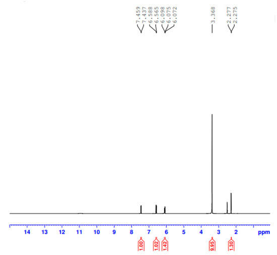 Figure 5 contains the 1H NMR spectrum of the F1-Zn(II) complex collected in a DMSO-d6 solvent at room temperature. The 1H NMR chemical shifts obtained from the complex’s spectrum are listed in Table 4 and compared with the free F1 molecule [30]. In the complex spectrum, the signals located at 2.27 and 2.28 ppm could be attributed to protons of −CH3 moieties, and the protons of −CH2 moieties could be responsible for the signals appearing at 6.57 and 6.59 ppm. The aromatic protons and the pyridine ring’s protons resonated in the 7.44–7.46 ppm range. The characteristic signal due to the (–COOH) proton, which is observed at δ 11.78 ppm in the spectrum of the free F1, is no longer observed in the spectrum of the complex. This suggested the deprotonation of the −COOH group and the participation in complexation with Zn(II) ion. The signal that appeared at 3.36 ppm may be due to the protons of the coordinated water molecules.