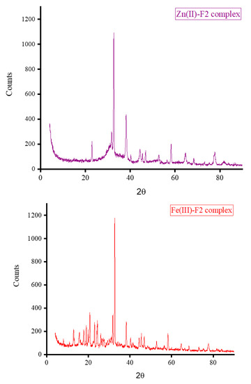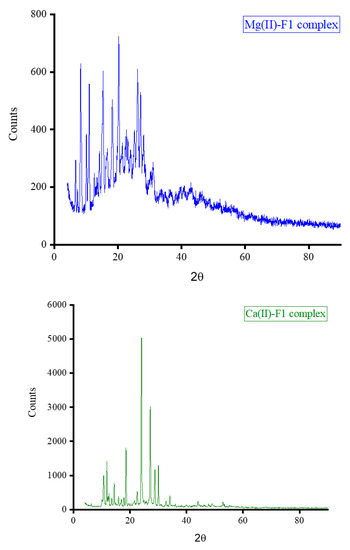 The XRD diffractograms of the F1 and F2 complexes with Mg(II), Ca(II), Zn(II), and Fe(III) ions.
