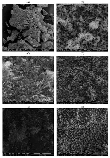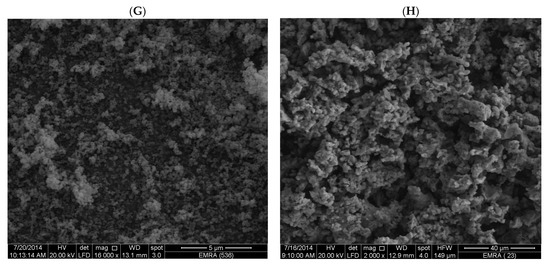 The SEM micrographs of the F1 and F2 complexes: (A) Mg(II)-F1 complex, (B) Ca(II)-F1 complex, (C) Zn(II)-F1 complex, (D) Fe(III)-F1 complex, (E) Mg(II)-F2 complex, (F) Ca(II)-F2 complex, (G) Zn(II)-F2 complex, and (H) Fe(III)-F2 complex.