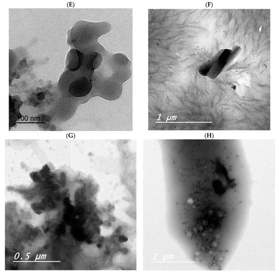 The TEM micrographs of the F1 and F2 complexes: (A) Mg(II)-F1 complex, (B) Ca(II)-F1 complex, (C) Zn(II)-F1 complex, (D) Fe(III)-F1 complex, (E) Mg(II)-F2 complex, (F) Ca(II)-F2 complex, (G) Zn(II)-F2 complex, and (H) Fe(III)-F2 complex.