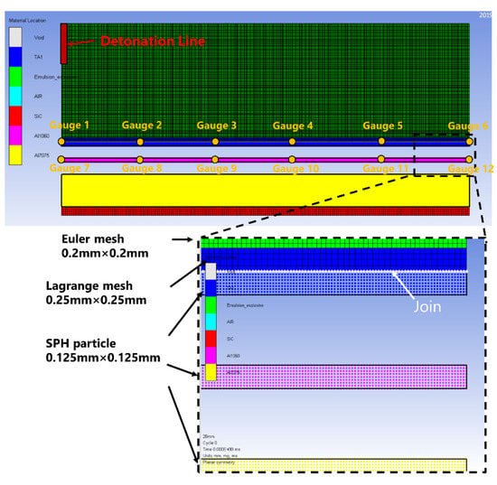 - Sun, Z.R.; Shi, C.G.; Xu, F.; Feng, K.; Zhou, C.H.; Wu, X.M. Detonation process analysis and interface morphology distribution of double vertical explosive welding by SPH 2D/3D numerical simulation and experiment. Mater. Des. 2020, 191, 108630. [Google Scholar] [CrossRef]