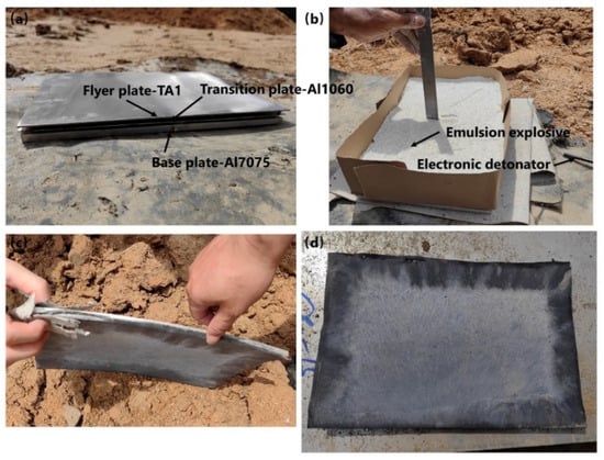 - Wu, X.; Shi, C.; Fang, Z.; Lin, S.; Sun, Z. Comparative study on welding energy and Interface characteristics of titanium—Aluminum explosive composites with and without interlayer. Mater. Des. 2021, 197, 109279. [Google Scholar] [CrossRef]