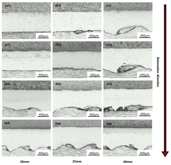 - Sun, Z.; Shi, C.; Wu, X.; Shi, H. Comprehensive investigation of effect of the charge thickness and stand-off gap on interface characteristics of explosively welded TA2 and Q235B. Compos. Interfaces 2020, 27, 977–993. [Google Scholar] [CrossRef]