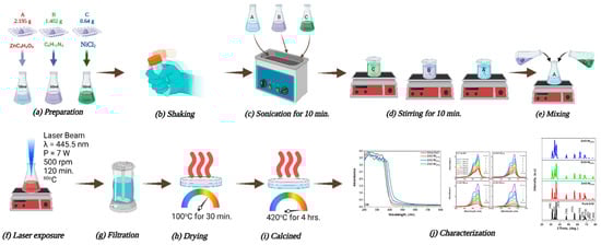 Modern laser technology and a better understanding of the interaction between lasers and target materials are required to facilitate rapid processing and technological advances that can produce excellent nanomaterials. Laser-assisted systems run in pulse mode or continuous wave mode with wavelengths differing from UV to IR. In the manufacture of metal oxide nanoparticles, the application of a laser can induce heating effects, provide controllable chemical reactions, and generate other complicated nucleation and particle enhancement phenomena. These affordances are due to this technique’s simplicity, expandability, high returns, and inexpensiveness [40,41]. Laser-assisted chemical bath synthesis (LACBS) technology began to be widely used because it facilitates the production of nanomaterials in several forms and can be used as a mechanism to sense the elements in manufacturing. The essential step of this technique is the photothermal effect from exposure by a focused laser on the target while ensuring that it has high temperature control resulting from the exposure. The synthesis parameters and physical properties are carefully controlled, and the efficiency of the synthesis of metal oxides using the LACBS technique has shown considerable improvement [41,41].