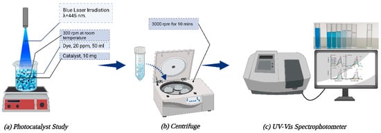 where denotes the initial concentration of MB prior to any exposure to light, while signifies the MB concentration at a specific time point following light irradiation. Moreover, Ao refers to the highest absorption peak observed before irradiation, whereas A represents the corresponding peak after irradiation has occurred. represents the photodegradation efficiency, while represents the rate of degradation. Figure 2 illustrates the schematic representation of the photocatalytic investigation being conducted.